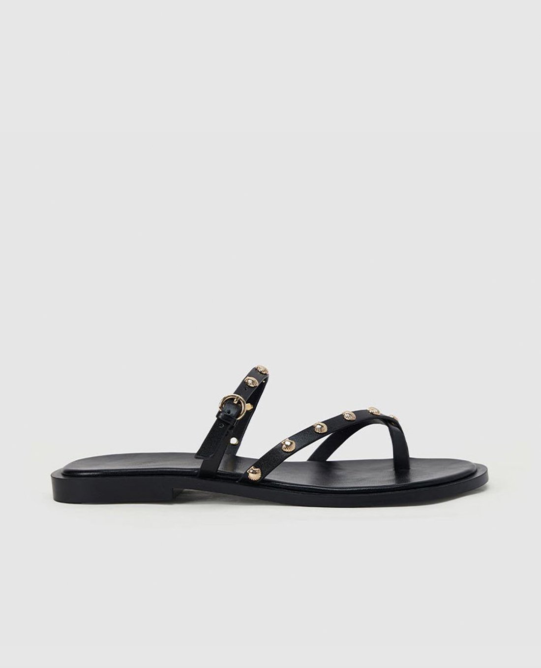 - Quai dép được trang trí bằng những đinh tán nhỏ màu vàng đồng tăng thêm vẻ cá tính, nổi bật