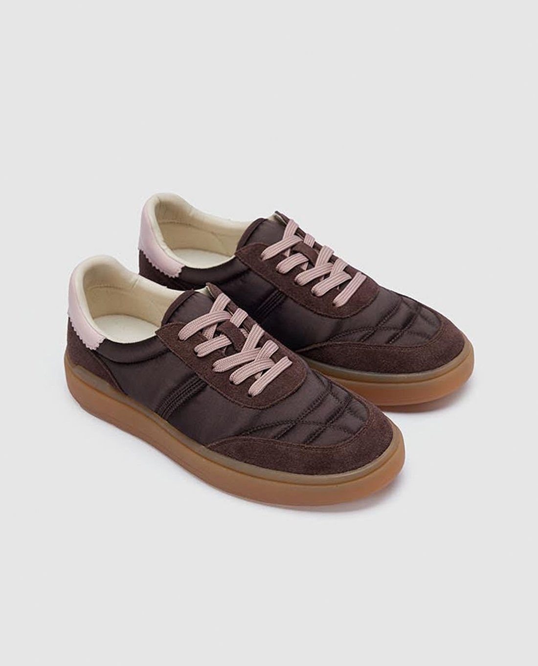 - Phối màu nâu trầm kết hợp dây giày hồng pastel nổi bật