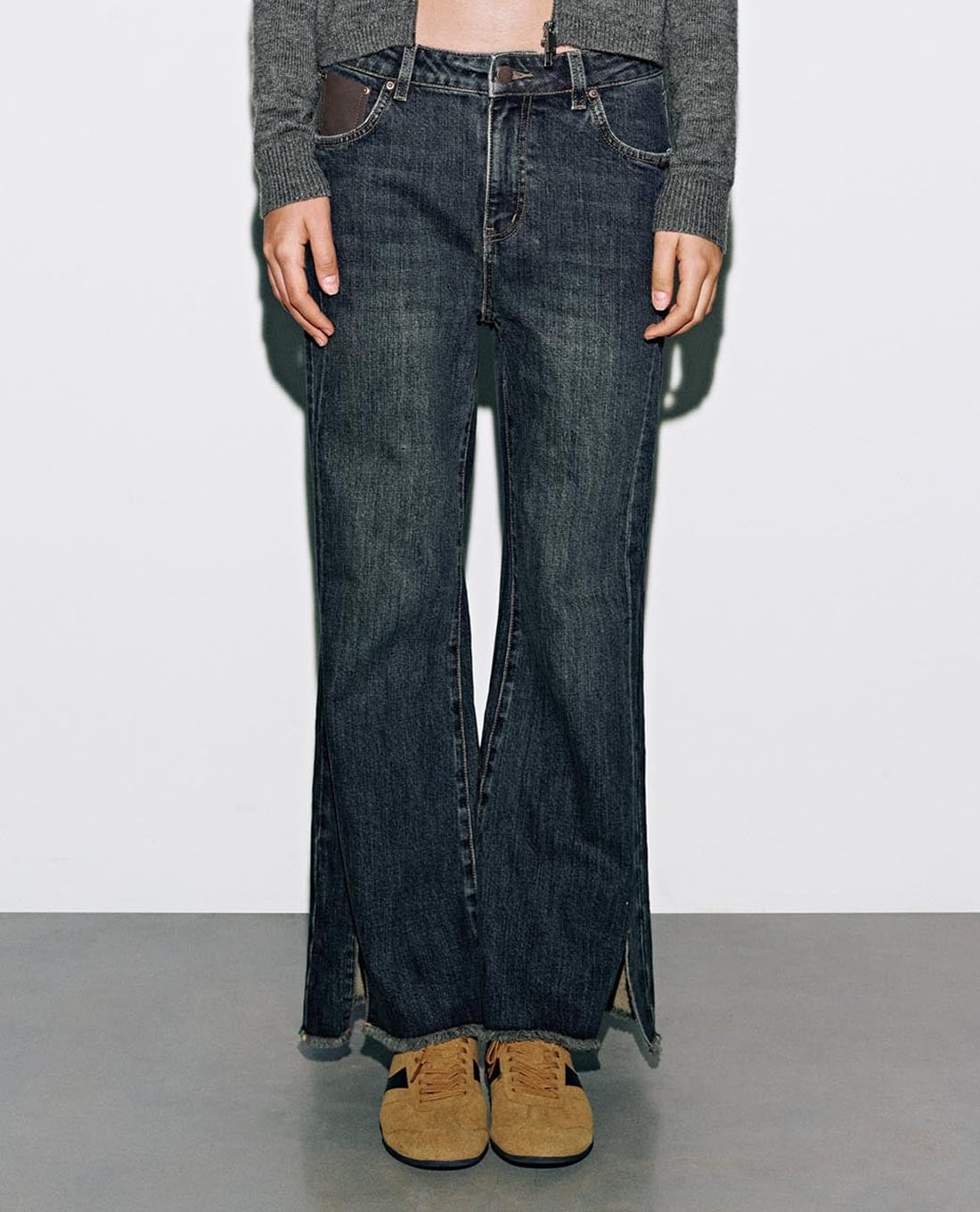 Quần jeans nữ ống loe wash bạc xẻ tà