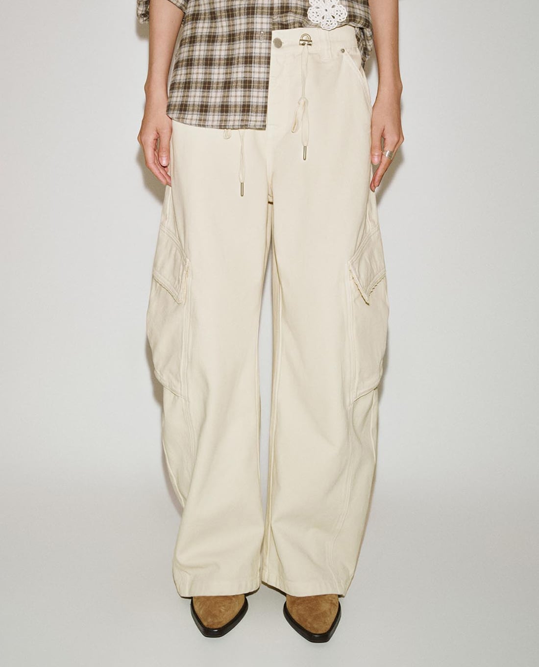 Quần jeans nữ ống rộng dây rút phối túi hộp