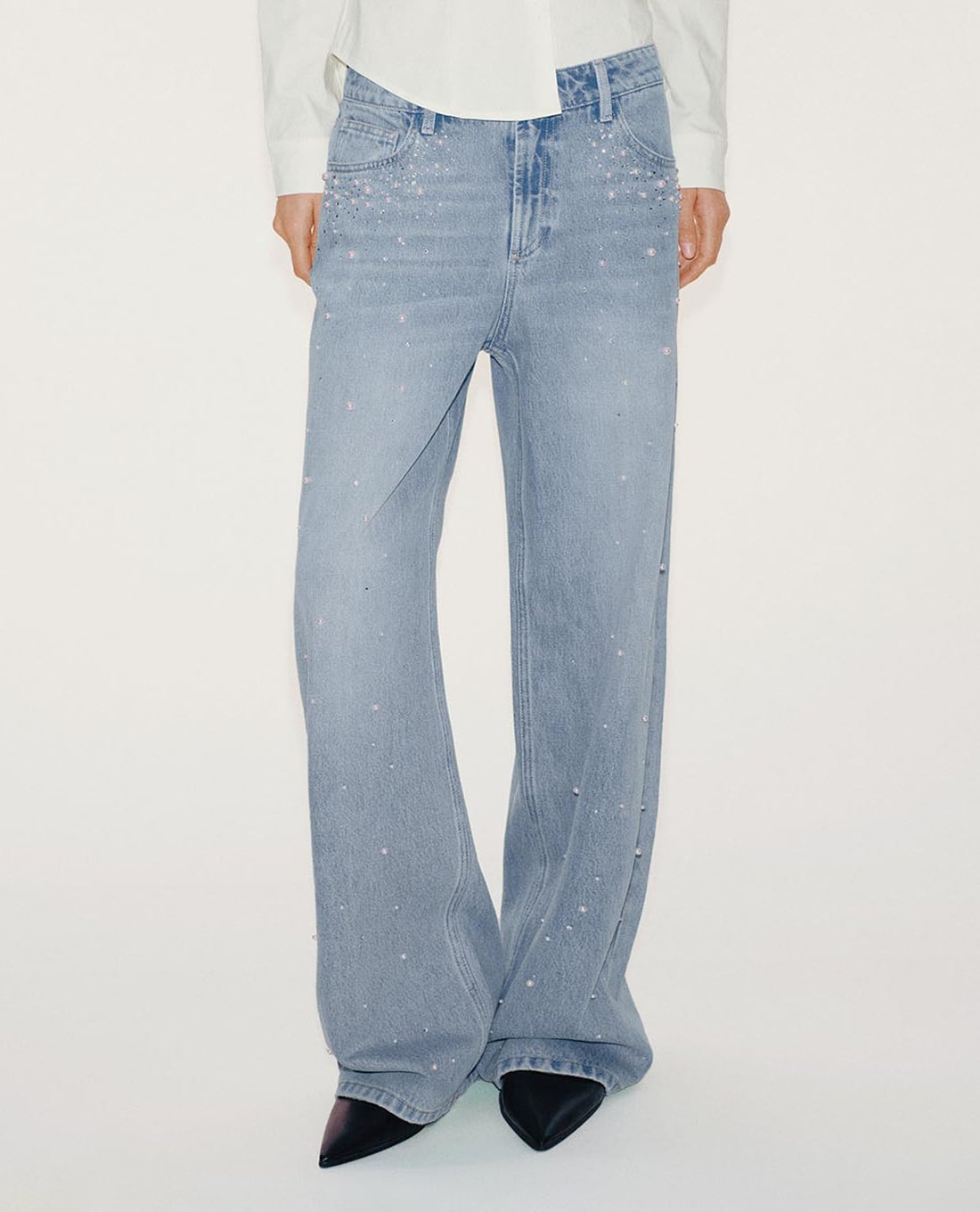 Quần jeans nữ ống rộng đính đá