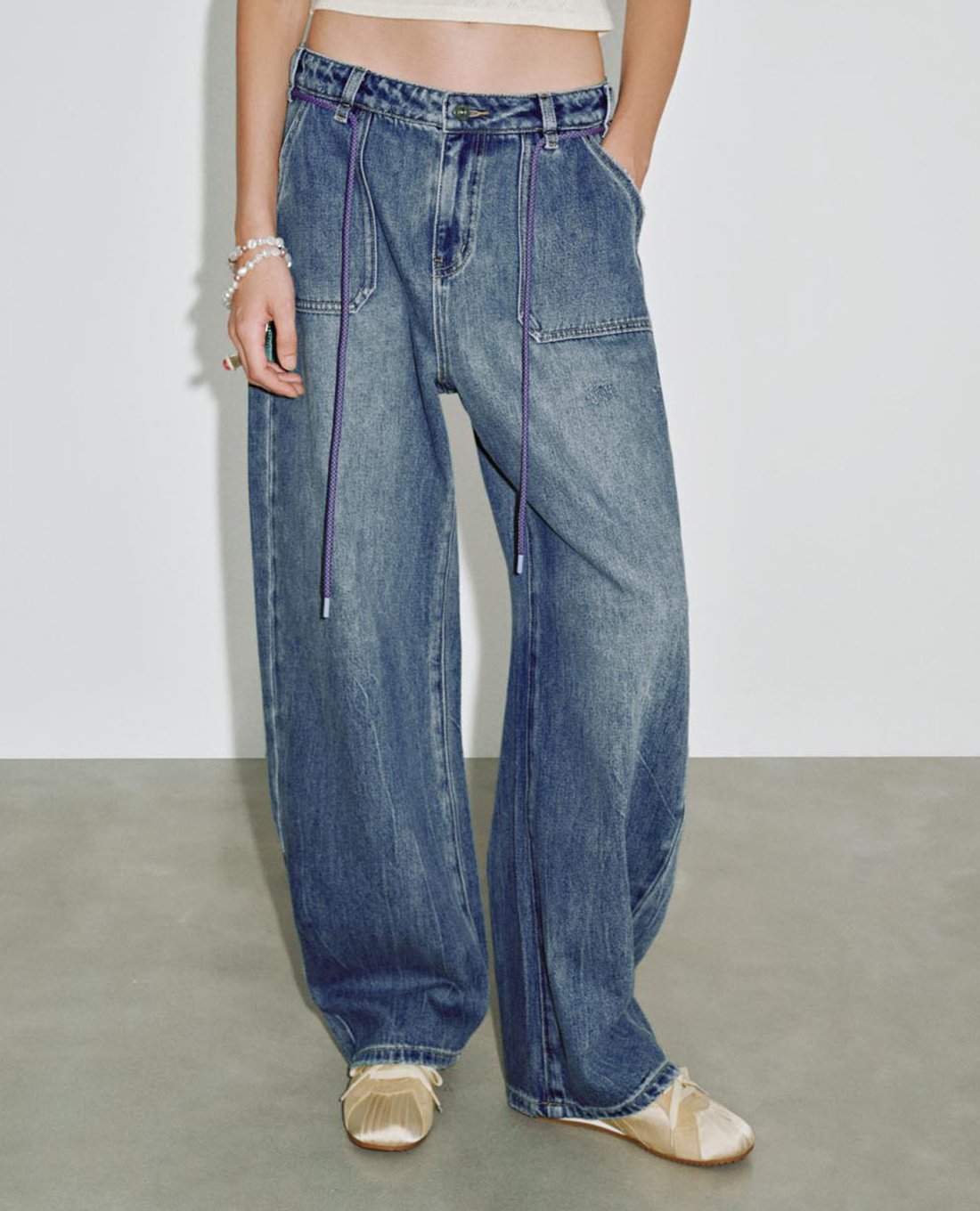 Quần jeans nữ ống rộng phối dây rút