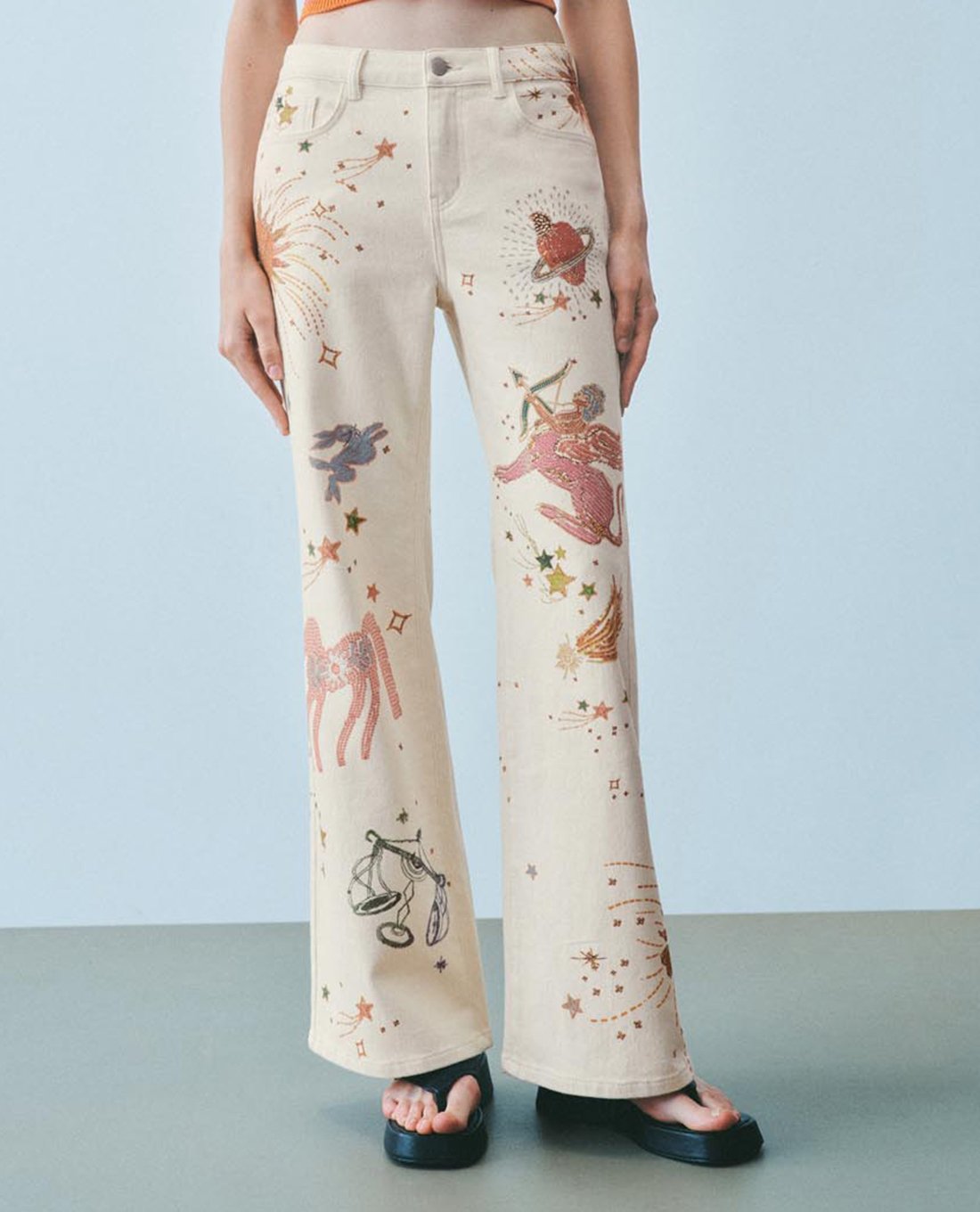 Quần jeans nữ ống rộng phối họa tiết thêu nổi