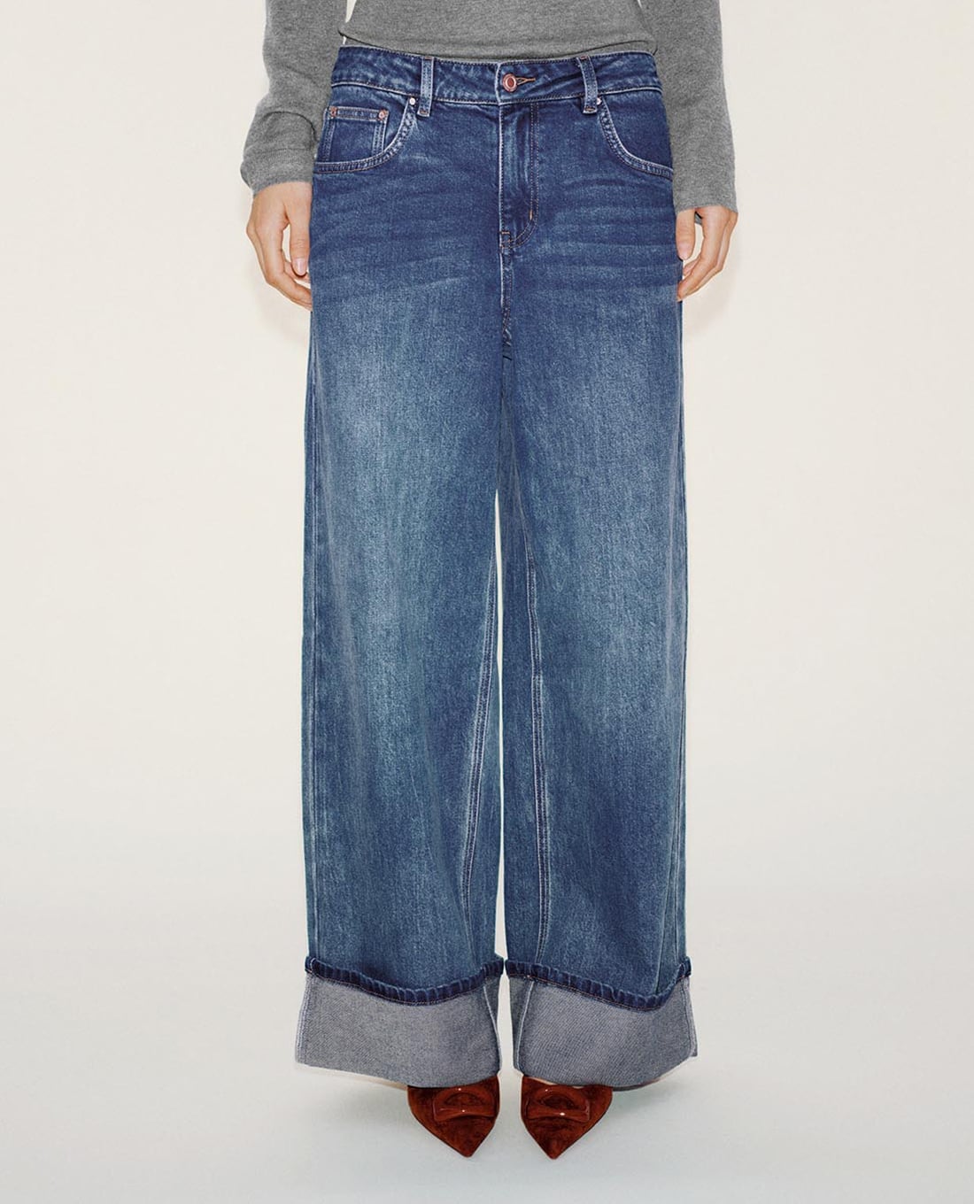 Quần jeans nữ ống rộng wash bạc gập gấu