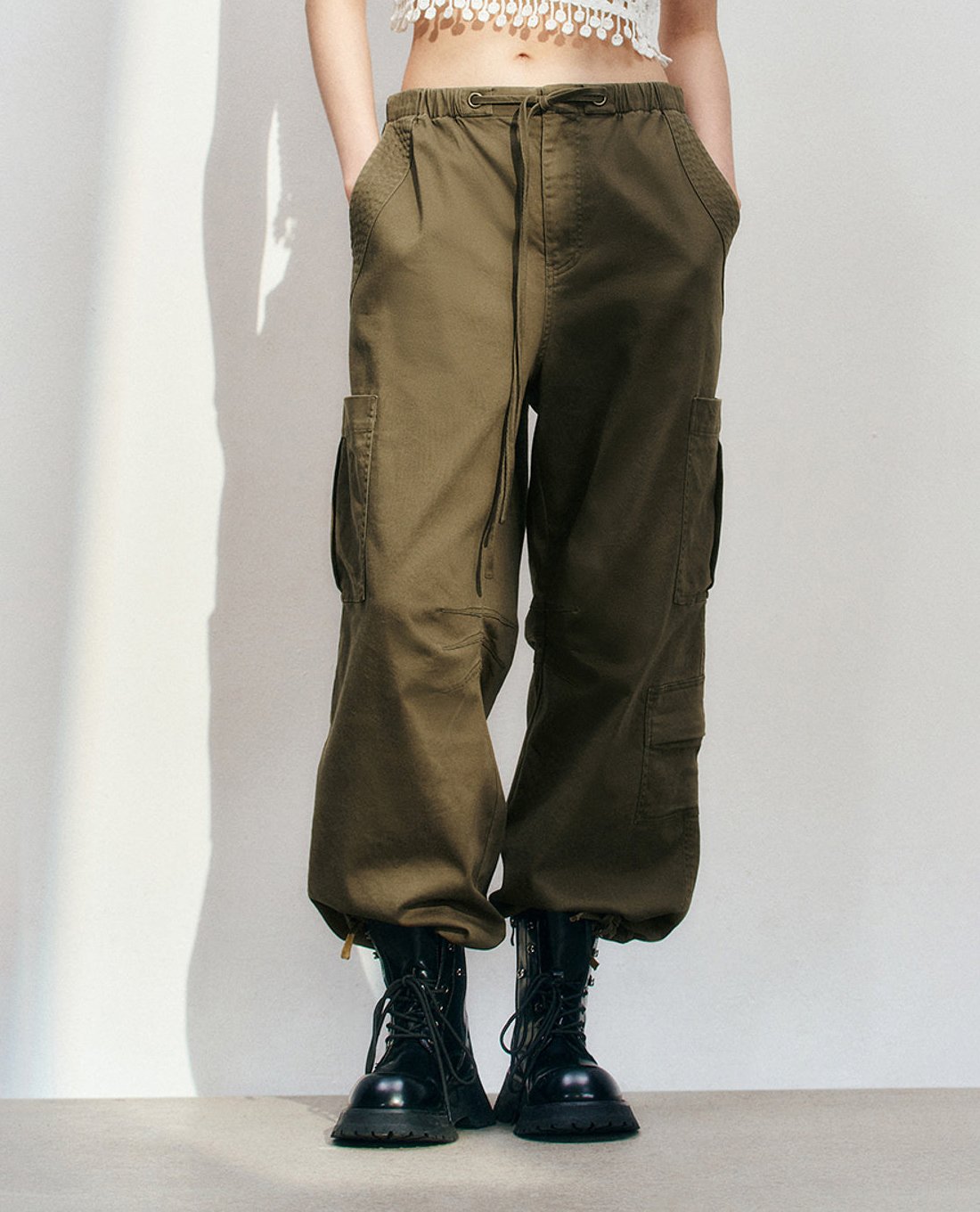 - Lưng thun phối dây buộc eo tạo điểm nhấn