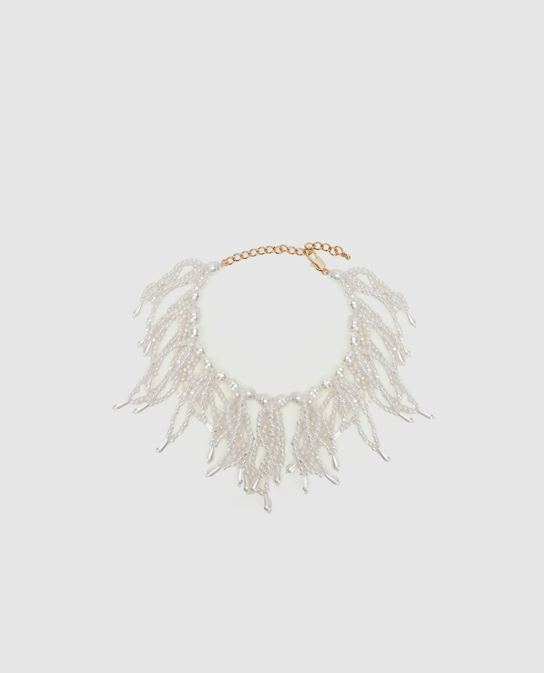 - Thiết kế vòng cổ với dải ngọc trai rũ mềm mại